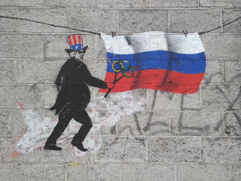 в сборной России нет участников зимней олимпиады из Осетии, но это не значит, что здесь нет неравнодушных людей. пару дней назад случайно увидел эти два граффити на стене дома в центре Владикавказа. довольно любопытные, хорошо нарисованные, изобретательные и на злобу дня, но не совсем могу понять что хотел сказать уличный художник.