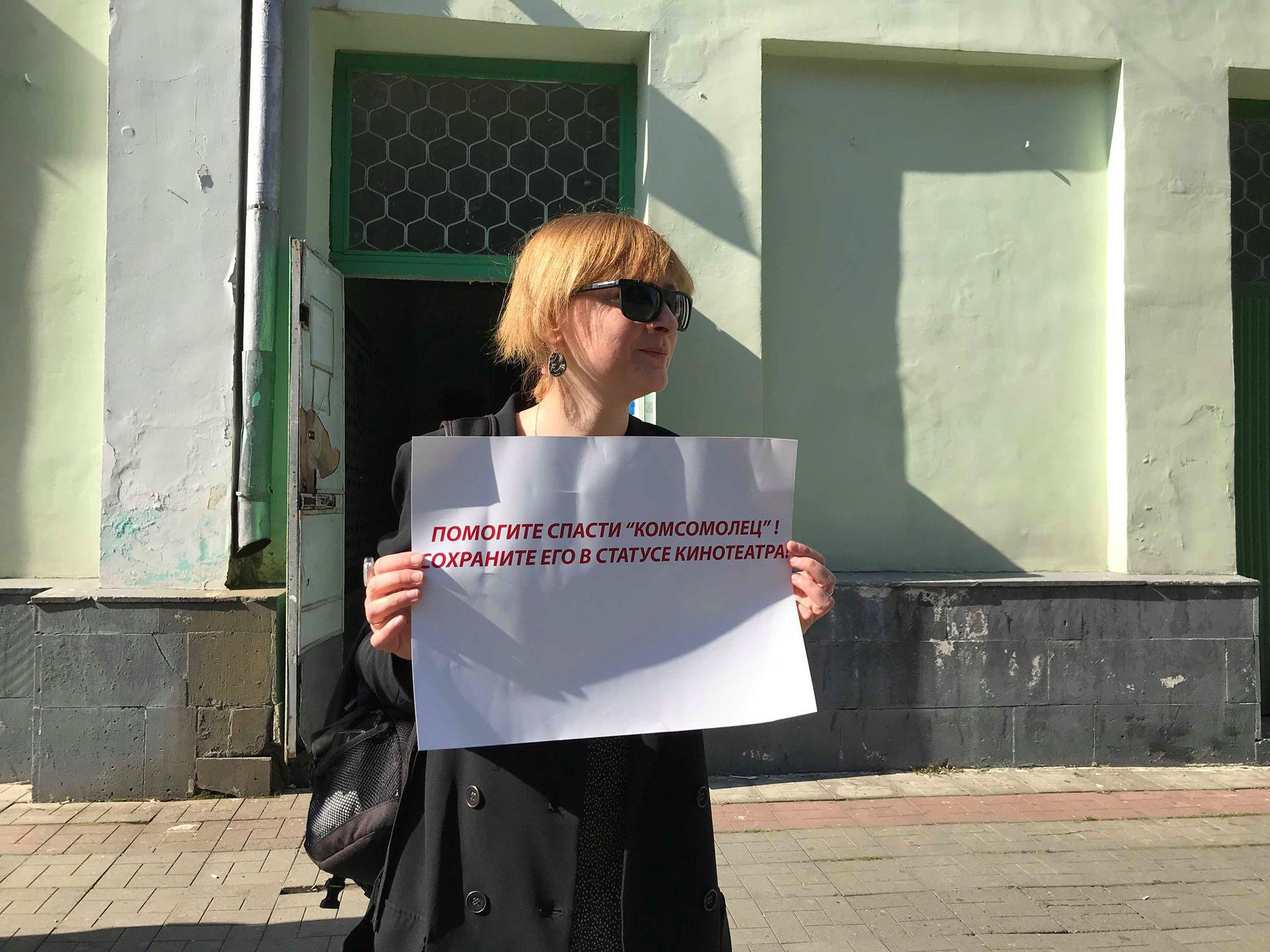 второй день подряд журналист Анна Кабисова выходит на Проспект Мира с одиночным пикетом против снятия с кинотеатра "Комсомолец" статуса юридического лица.