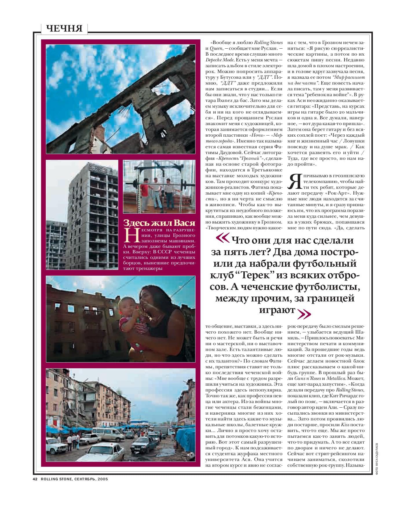 в 2005-м году в Грозном должны были провести масштабный всероссийский рок-фестиваль. я ухватился за эту идею, чтобы написать репортаж, но за пару дней до начала фестиваля объявили о его отмене по причинам безопасности. все-таки, Грозный в 2005 году был не самым спокойным городом. но я все же поехал, чтобы написать о том, какая есть в республике культурная жизнь. в итоге репортаж вышел в крутом журнальчике Rolling Stone и стал одним из первых по сути текстов из Грозного не на тему войны. предлагаю к прочтению. в сети его кстати нет, так что, в интернете публикуется впервые.