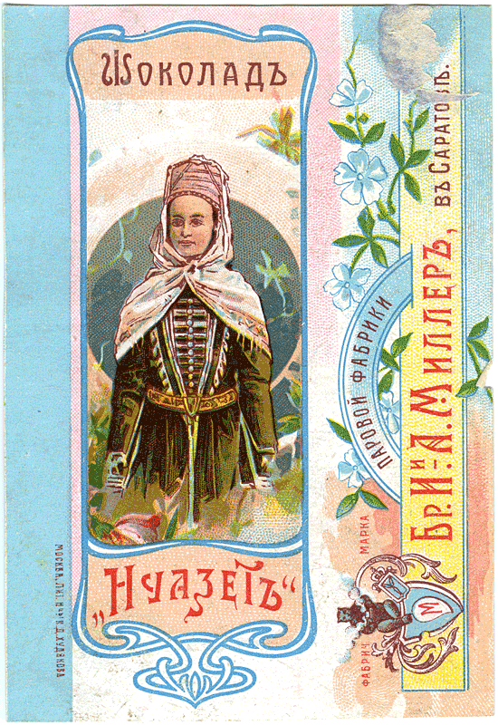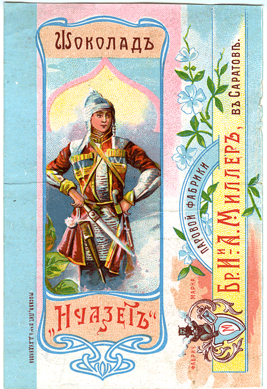 Тема Кавказа появляется на фантиках и обертках примерно в это же время. И реализуется не через изображение природы Кавказа, горы и буйные реки (что будет уже в советское время), а через изображения кавказских типажей. Например, фабрика братьев Миллер выпускает серию шоколада «Нуазет», в упаковке доминируют восточные мотивы, некий обобщенный образ Востока вообще. Отметим, что использование восточных мотивов как реакция на поражение в Крымской войне было характерно для рекламы, рекламных постеров во второй половине XIX века — слоны, изнеженные красавицы на атласных подушках, турки в фесках появлялись в это время в рекламе сигарет и мыла.