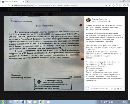 Причиной моего обращения послужила фотография некого информационного письма, об указании Министра Внутренних дел России Владимира Колокольцева о продлении сроков командировки сотрудников полиции из различных регионов в СКФО и размере их денежных выплат.