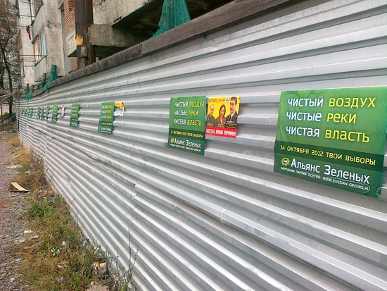 город весь абсолютно заклеен политической рекламой, очень навязчивой. надпись "Патриоты России" на заднем стекле легковых машин встречается чуть ли не чаще, чем "продаю". каждое дерево, каждый угол, не говоря уже об остановках и тд... кстати, судя по тому что вижу маршрутчики поддержали Фадзаева, потому что они все в этой рекламе, либо "Патриотов", либо "Зеленых".