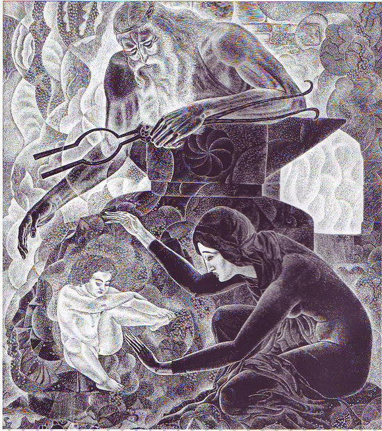 "«К одной кавказской скале прикованы нарт-мужчина, а к другой скале, через реку — женщина-нарт. Оба богатыря жаждут быть вместе. Они тянутся друг к другу. Наконец свершается чудо. Не дотянувшись через бурную горную реку, они все же рождают ребенка. Получают продолжение рода богатырей».