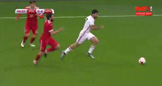 И вот иранец, бежит практически безпрепятственно, по всему полю, к воротам России.