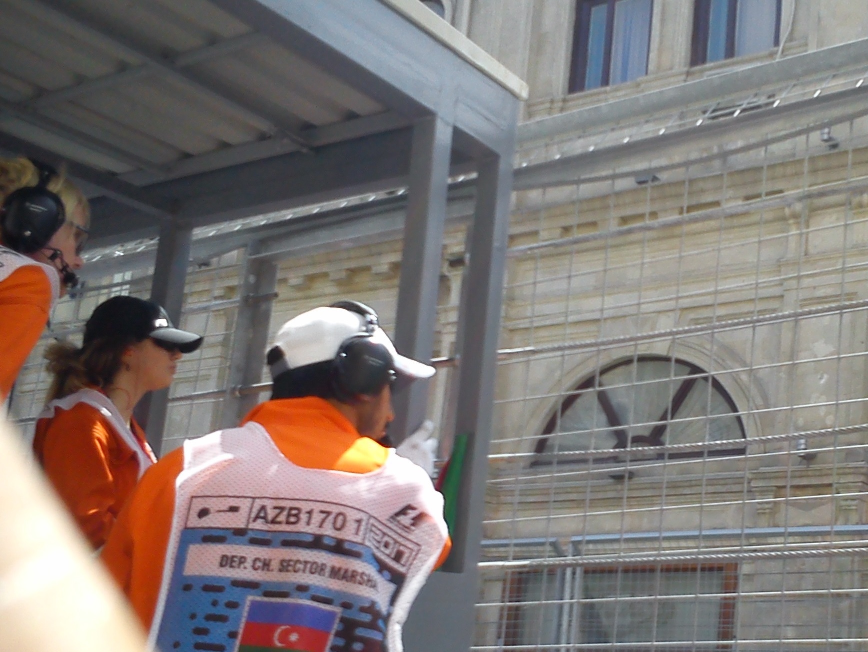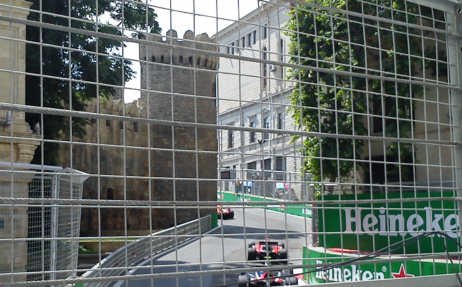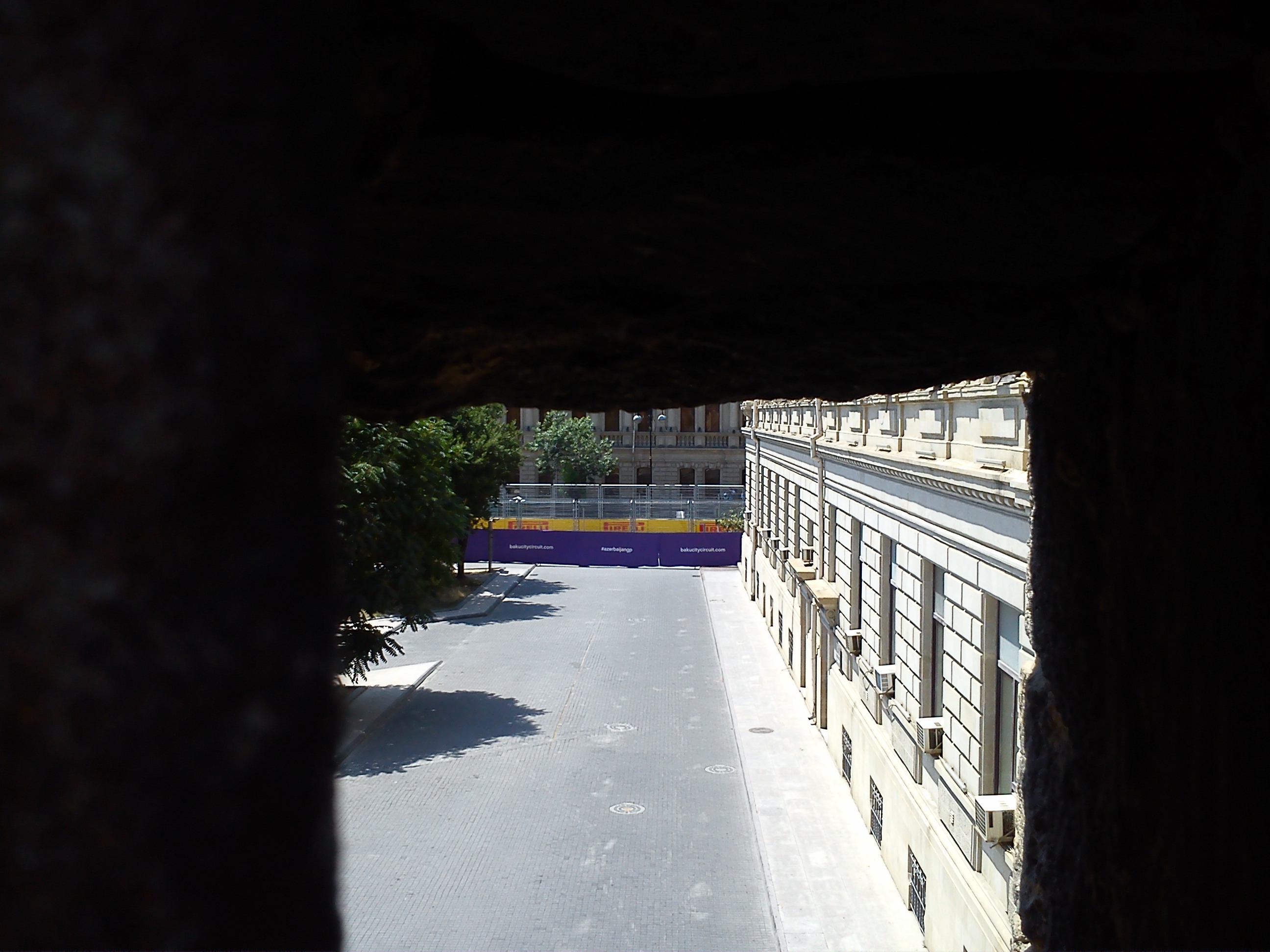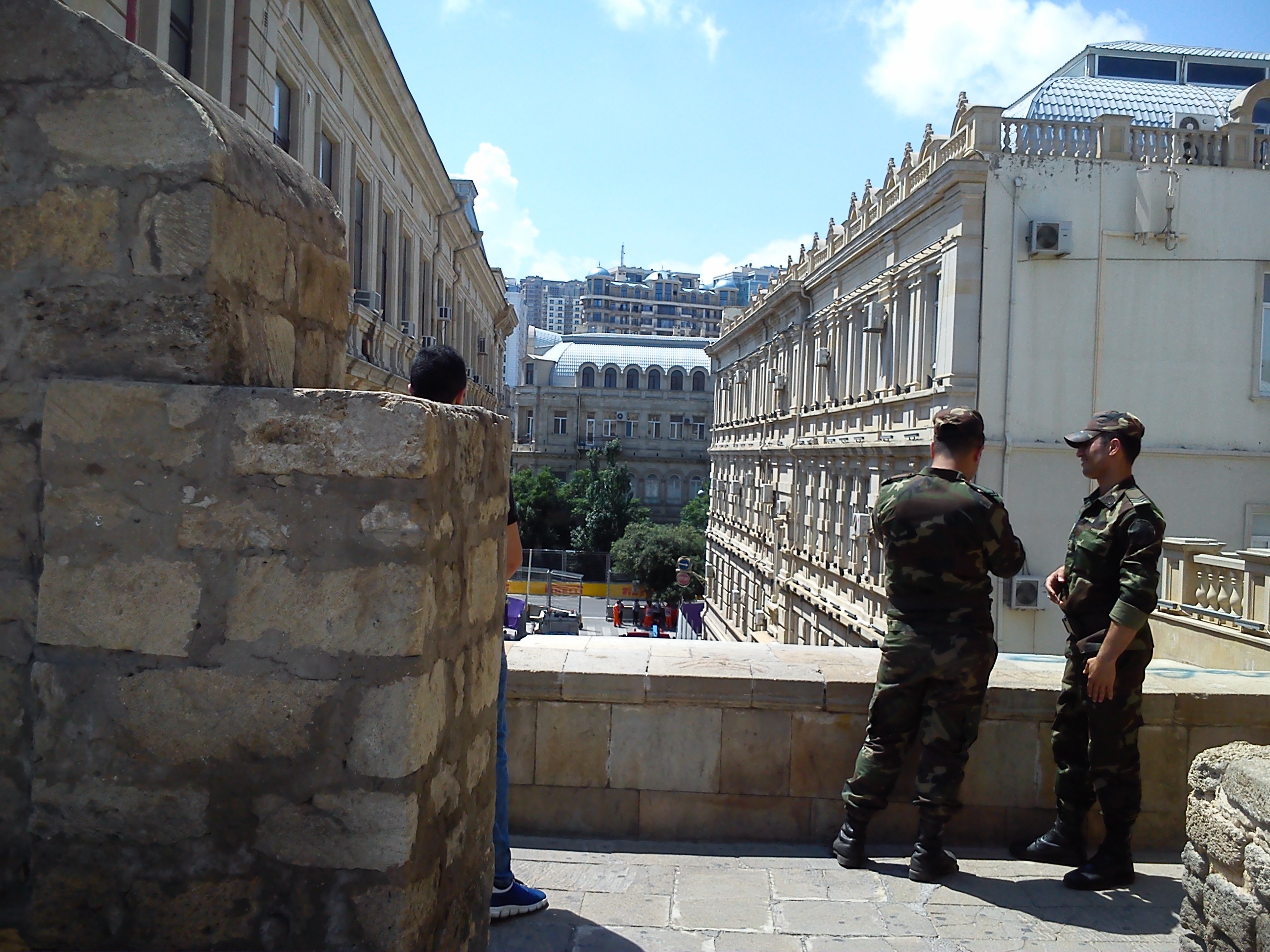 Сначала нашел амбразуру в Крепостной стене из которой видна часть трассы, очень небольшая, метра два.  Охранники не прогоняли, рядом со мной пристроился европейского вида турист в шортах.  Место не понравилось и отправился искать другое, нашел рядом с памятником М.А.Сабиру, на ул. Истиглалият (бывш Коммунистическа). Там толпились туристы, но солнце жарило как следует.  Пошел искать место лучше и нашел бомбовую точку прямо на углу бывш.кинотеатра "Азербайджан", ныне ресторан "Хард-рок". Суперская точка,  как раз то место где позавчера одна Формула не въехала в поворот и потеряла колесо. Я показывал видео с той аварии вчера.