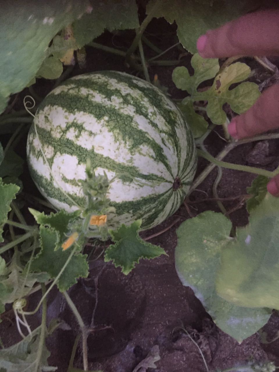 Арбуз — не поклонник этой гигантской ягоды, к тому же боюсь есть покупные арбузы из-за химии. А свой арбузик, молодой и белый еще, спрятавшийся подло за гигантскими листьями,  слопаю когда поспеет. От меня не убежит, как раз  20 августа вернусь на Апшерон.