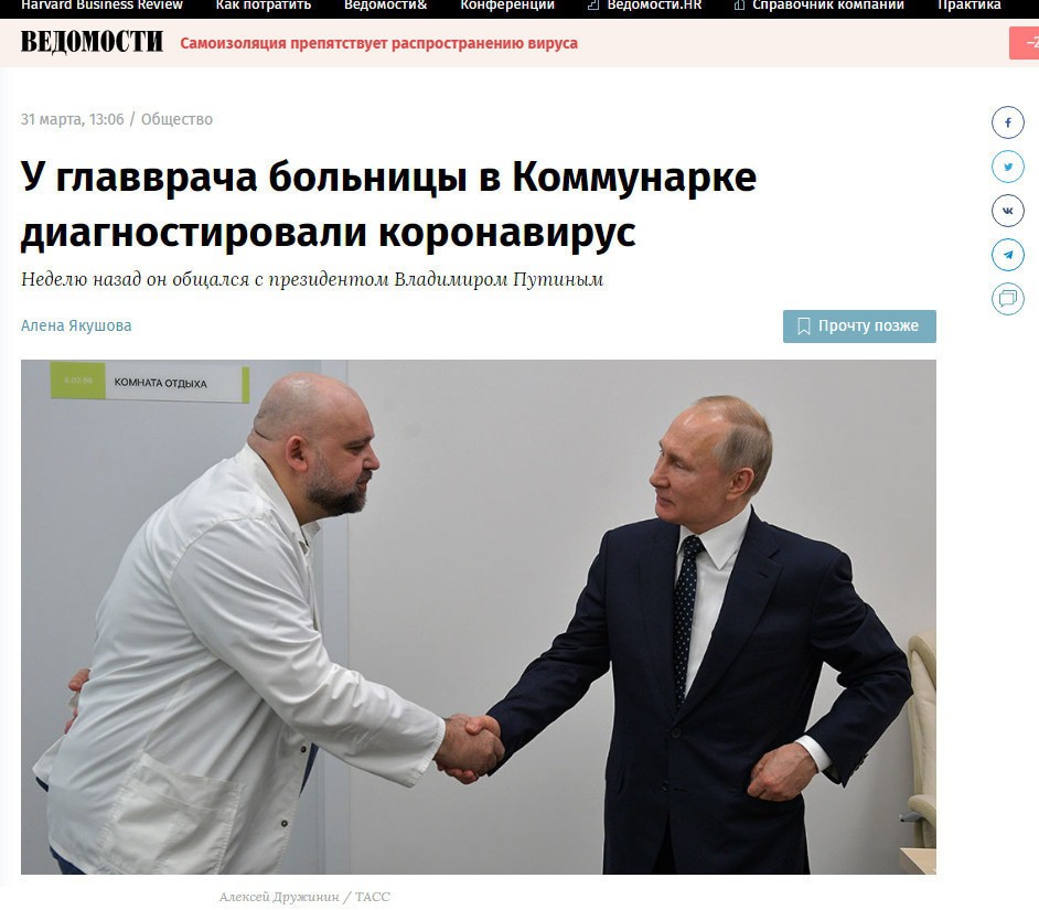 Не понял я Путина, что он делает? Вчера сообщили о заболевании коронавирусом главврача больницы ("Коммунарка"), с которым Путин близко общался позавчера, когда главрач и никто не знали о его болезни. Вчера тот доктор, узнав о зараженности, перешел на закрытый режим работы и жизни в своем кабинете. Общается с больницей через интернет.