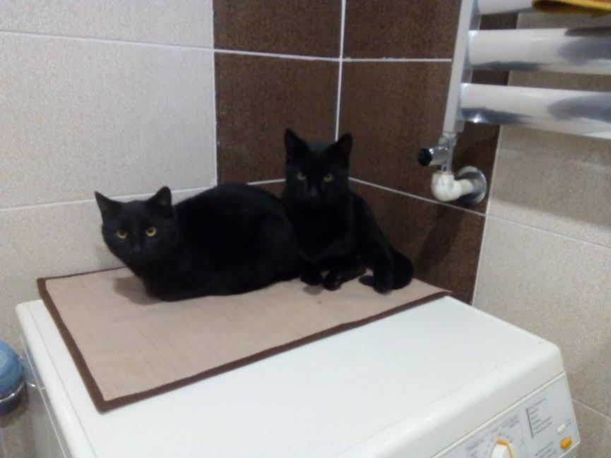 Куда девать котов? Погода тяжелая, мокрый снег, кругом мокро. Домик я вернул на прежнее место, но мороз ночами, ящик обложенный тряпками не спасет. Решили поместить котов в нашу ванную комнату, совмещенную с туалетом. Они сразу забрались на стиральную машину, удивленно взирая оттуда на людей в позах, в которых коты никогда нас не видели.