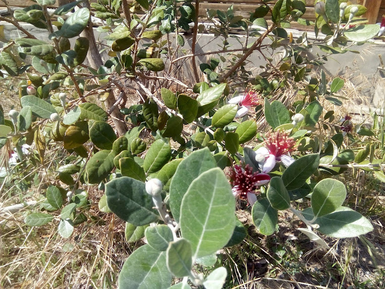 А это цветы фейхоа. Удивительная красота, впервые вижу в этом году. Вместо каждого цветка осенью будет полный йода плод похожий на маленький огурчик. В РФ не растет.