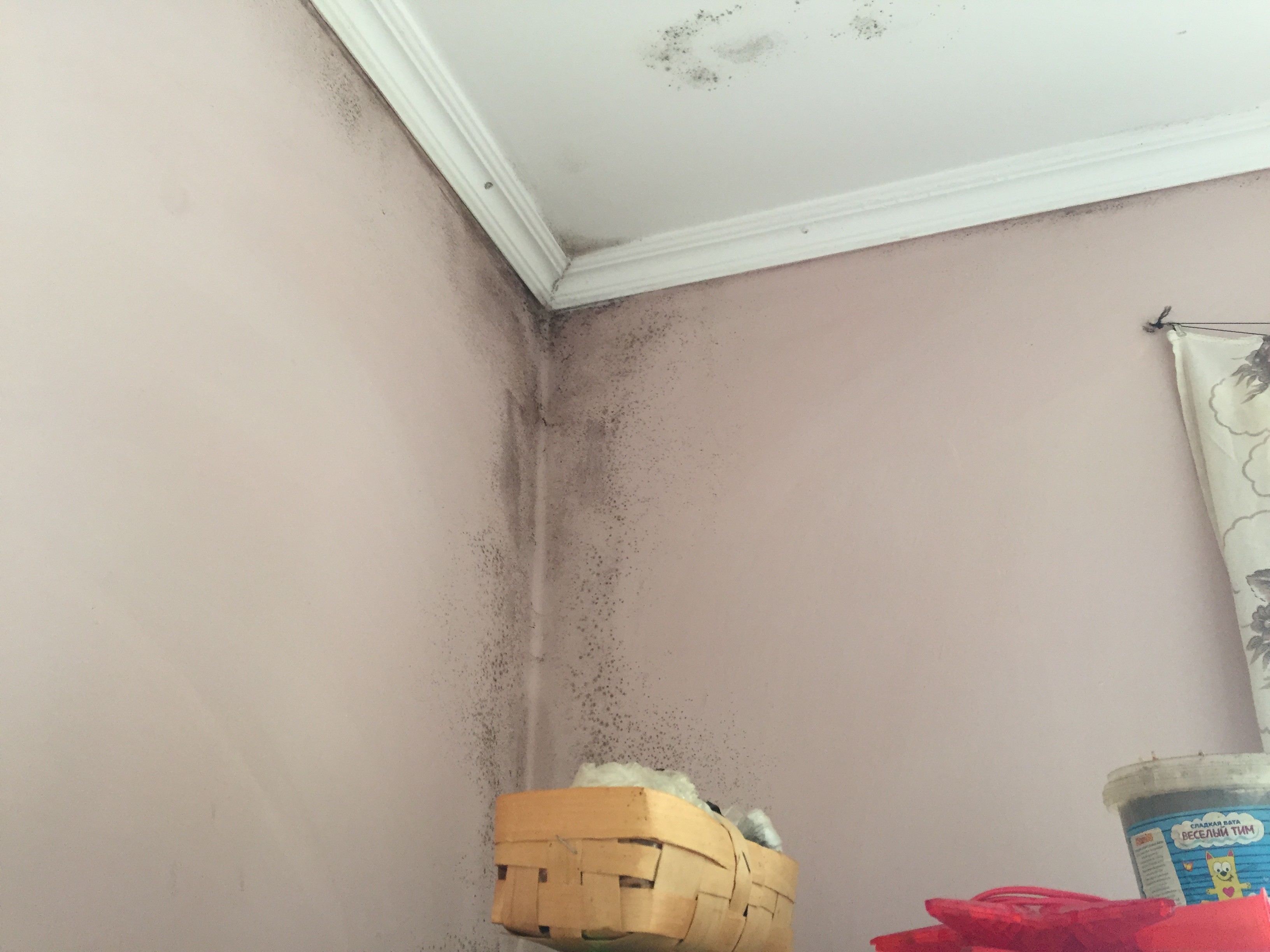 Джульетта рассказала, что грибок на стенах был уже до заселения.  Строители забелили стены, но  он вылез  с новой силой, расцвел пышным цветом.