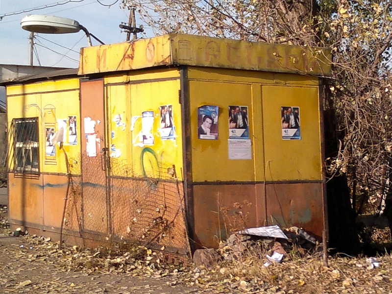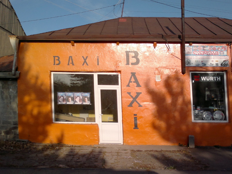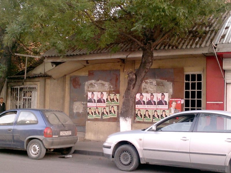 Предвыборные постеры Нино Бурджанадзе в окне магазина автозапчастей в Ахалкалаки.