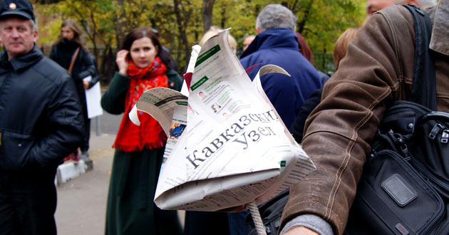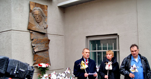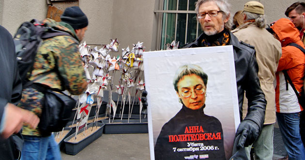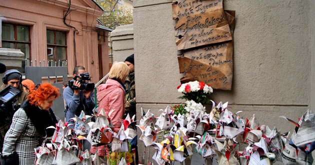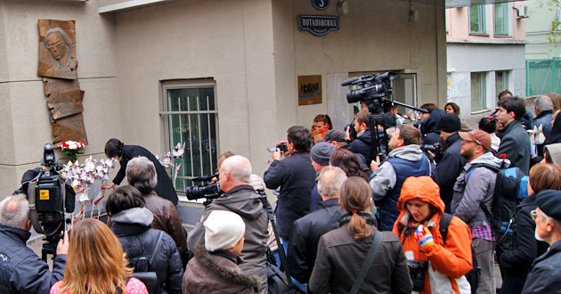Возложение бумажных цветов к мемориальной доске Анны Политковской. Москва, 7 октября 2014 г. Фоторепортаж корреспондента "Кавказского узла" Аиды Магомедовой