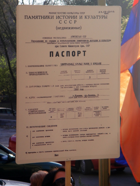 Инициативная группа движения “Освободим памятник от олигарха” 6 сентября провела в Ереване перед зданием министерства культуры акцию с требованием приостановить реконструкцию крытого рынка на проспекте Маштоца. Затем участники акции шествием двинулись в сторону здания правительства, прокуратуры, мэрии и дошли до крытого рынка. Перед всеми инстанциями активисты провели пикеты.
