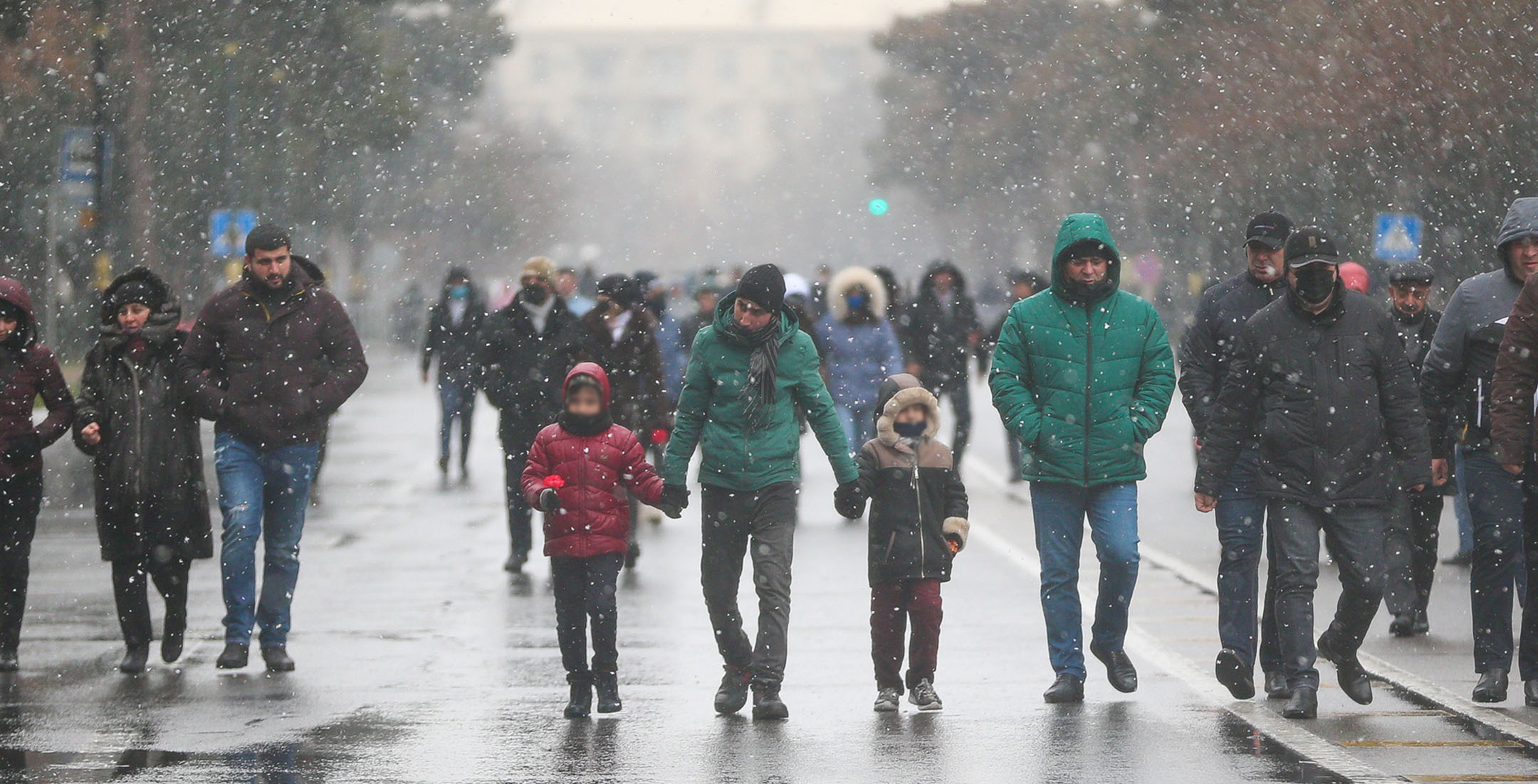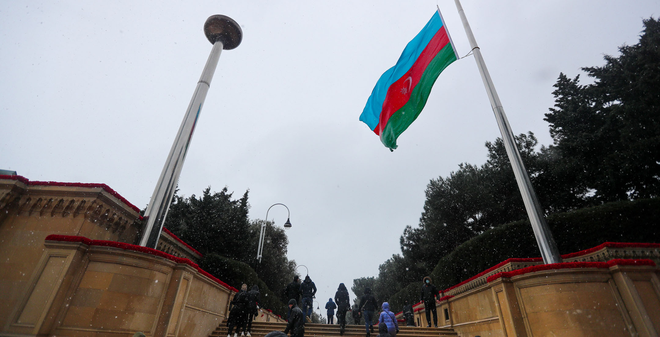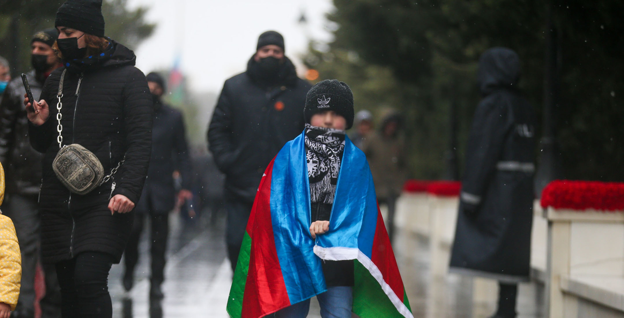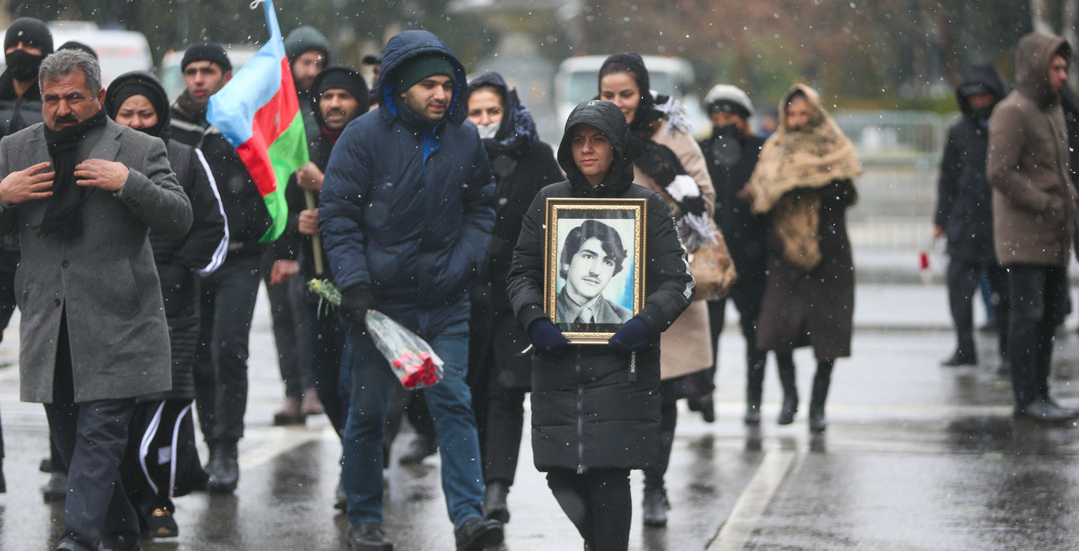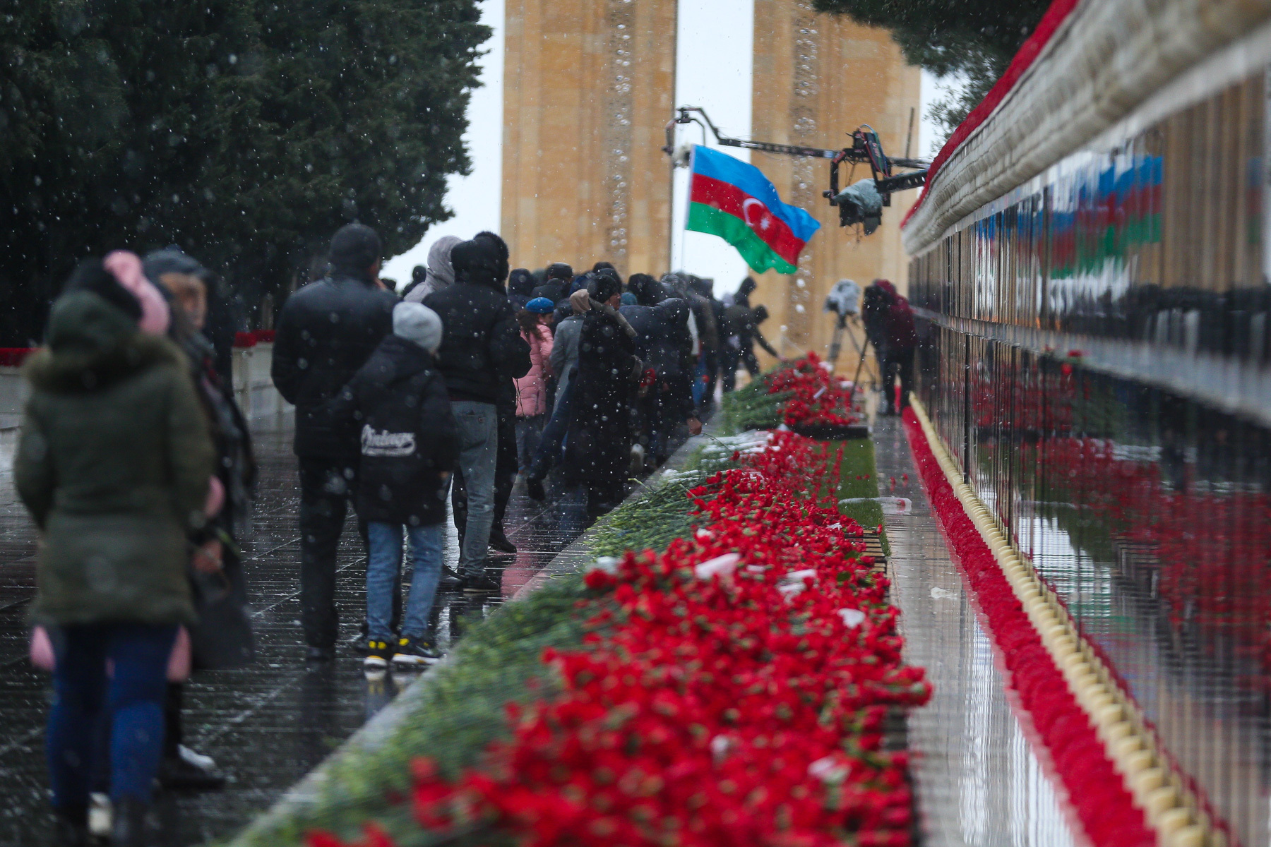 Жители Баку в 32-ю годовщину событий “Черного января” идут к Мемориалу шехидов, чтобы почтить память погибших после ввода войск в Азербайджан 20 января 1990 года. Несмотря на сильный ветер и мокрый снег, к мемориалу идут целыми семьями, с детьми, несут флаги и цветы. Баку, 20 января 2022 года. Репортаж фотокорреспондента “Кавказского узла” Азиза Каримова.