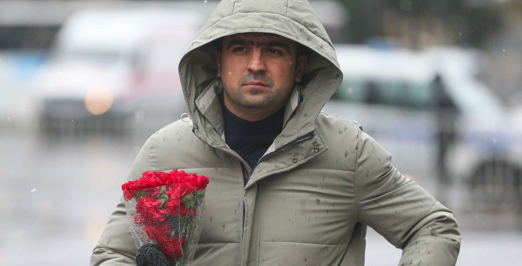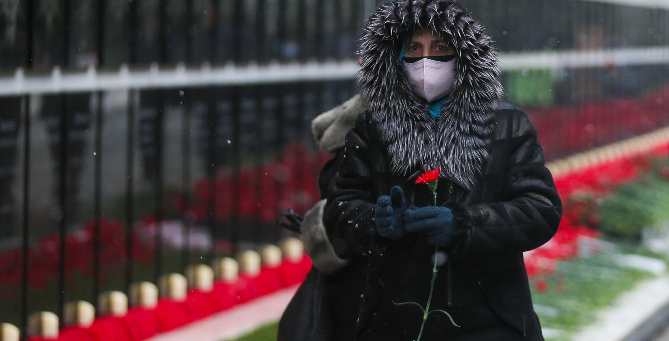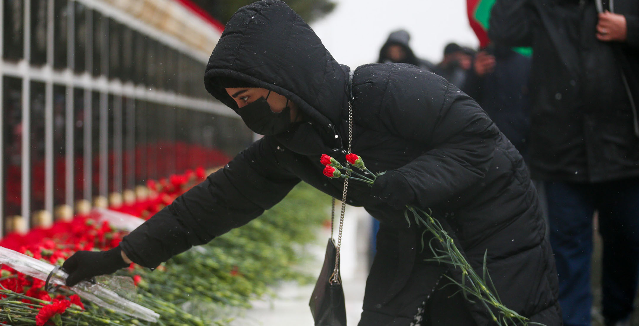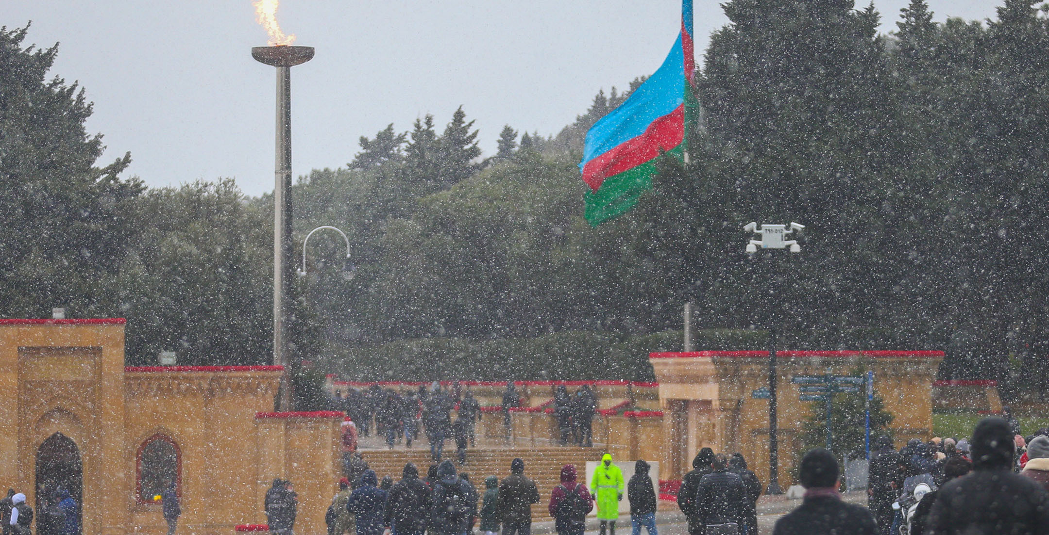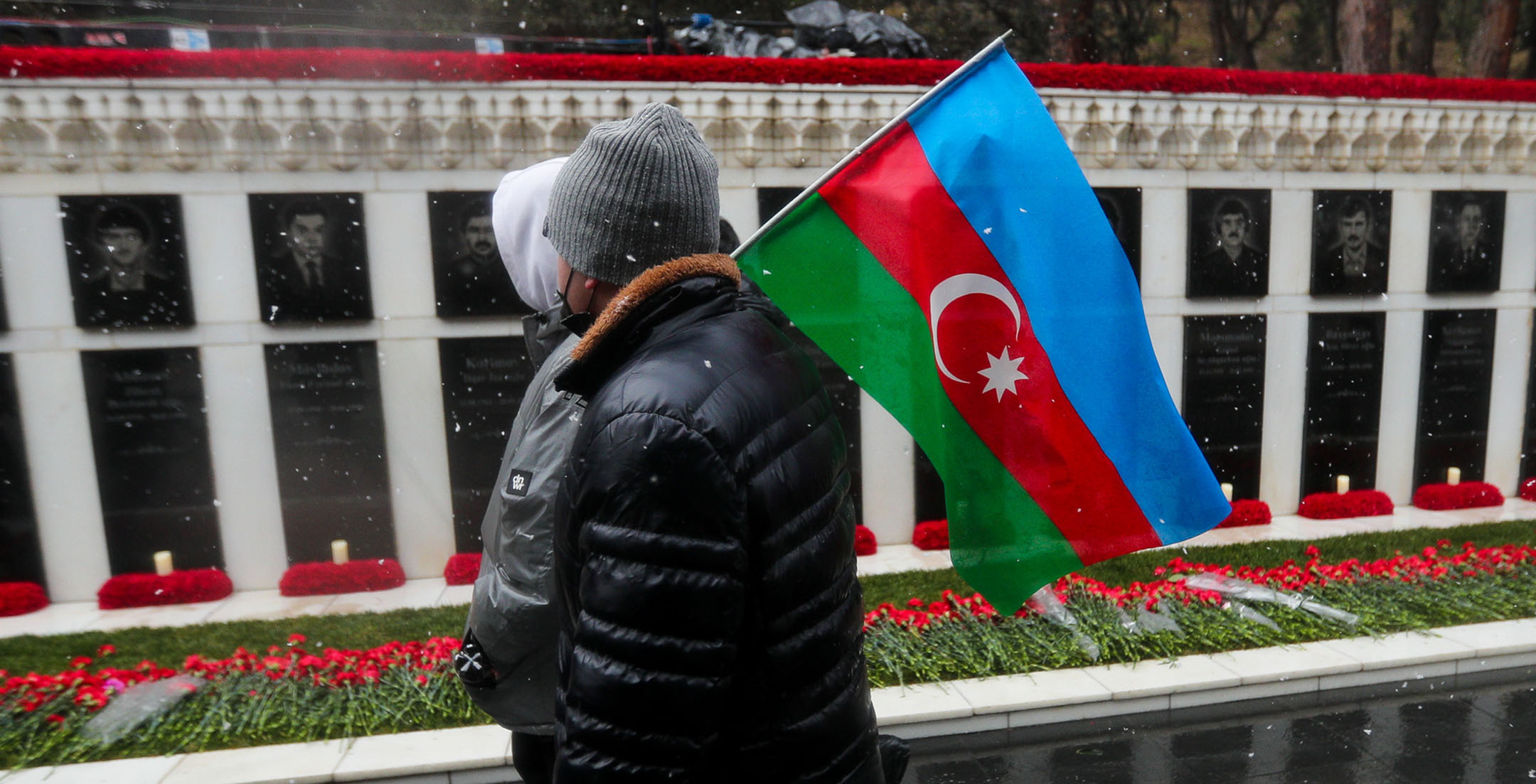 Жители Баку в 32-ю годовщину событий “Черного января” идут к Мемориалу шехидов, чтобы почтить память погибших после ввода войск в Азербайджан 20 января 1990 года. Несмотря на сильный ветер и мокрый снег, к мемориалу идут целыми семьями, с детьми, несут флаги и цветы. Баку, 20 января 2022 года. Репортаж фотокорреспондента “Кавказского узла” Азиза Каримова.