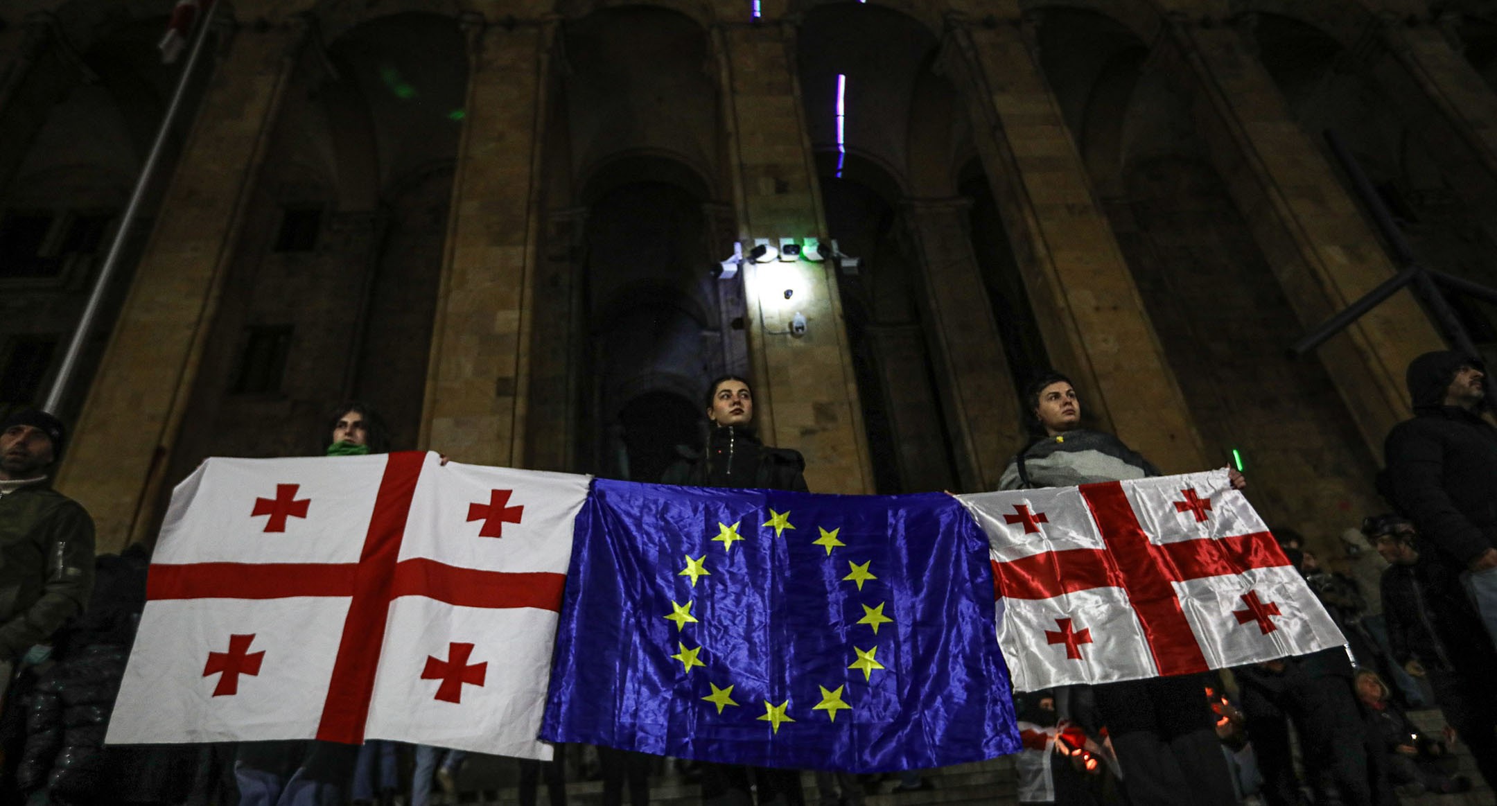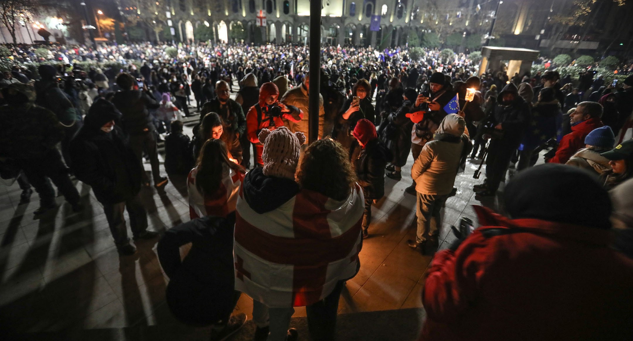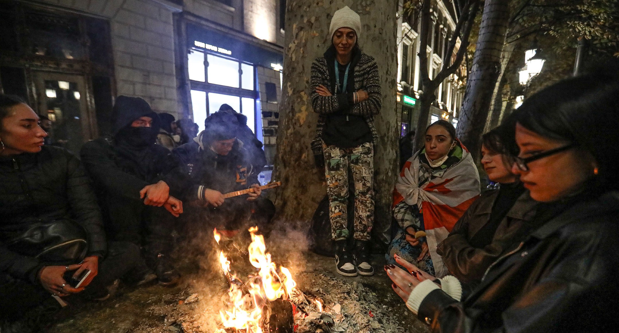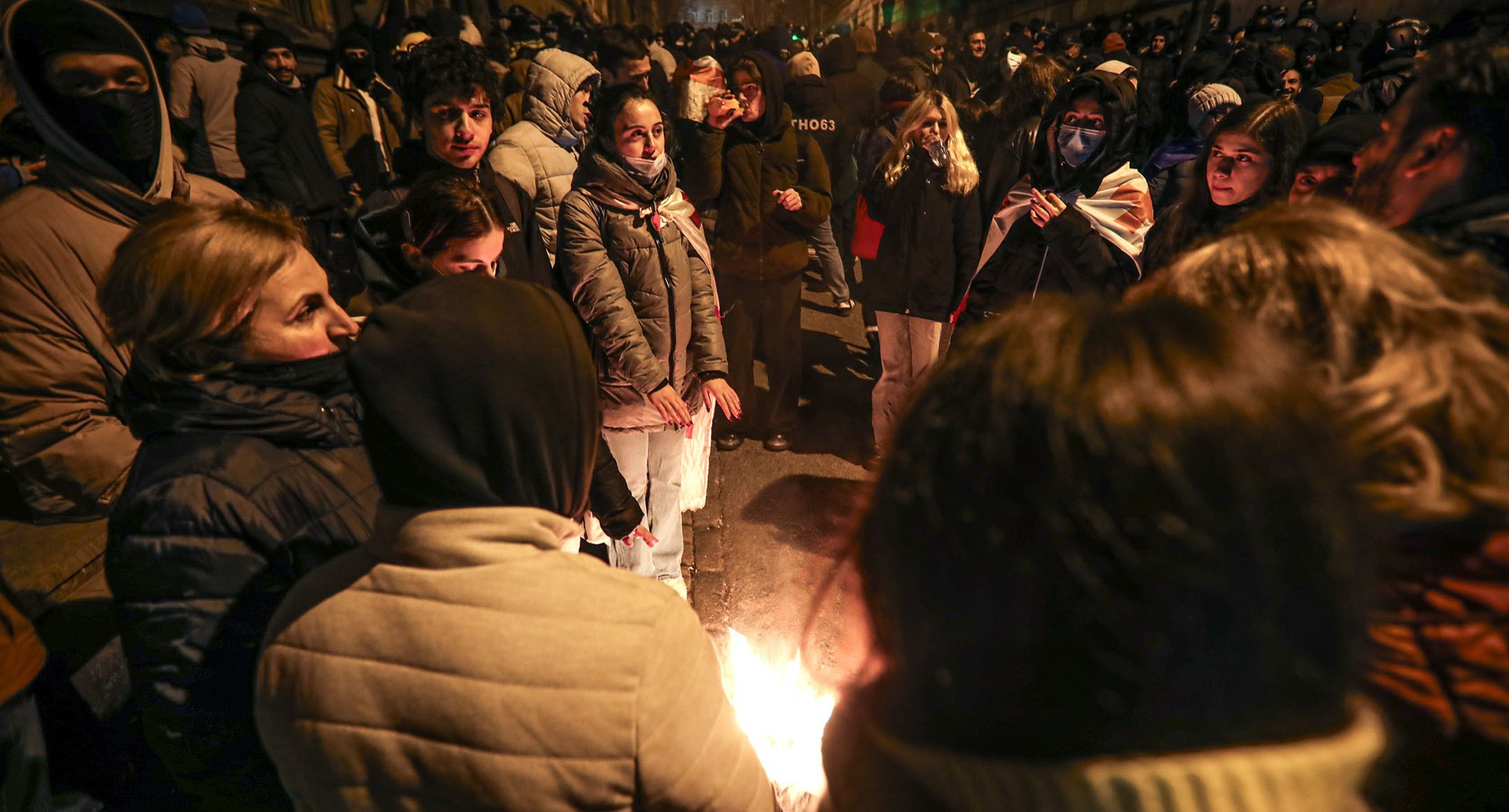 Сторонники евроинтеграции 5 декабря 2024 года восьмой день подряд вышли на гражданский протест в Тбилиси, перекрыв движение на проспекте Руставели, главной улице столицы. Полиция была стянута на боковые улицы у парламента Грузии, однако акция в ночь на 6 ноября завершилась без разгона. На проспекте Руставели были разожжены костры, вокруг которых грелись протестующие. Около здания парламента участники акции пели гимн Грузии. Позднее нескольких ее участников протеста, оставшихся около отеля Radisson, задержала полиция. О том как прошла очередная ночь протестов в Тбилиси – в фоторепортаже корреспондента “Кавказского узла” Азиза Каримова.