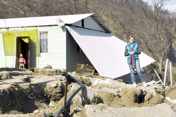 Жительница переулка Черешневый Наталья Киреева перед своим домом, пострадавшим от оползня